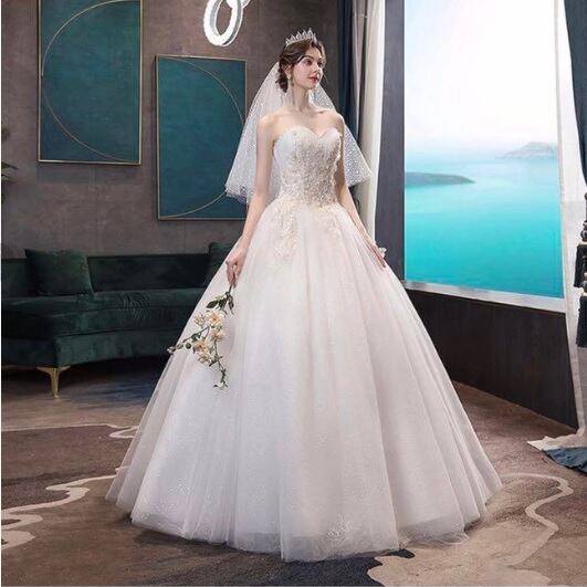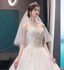 刺繍とチュ-ルのウェディング仕様のドレス。清楚な白のサテン地の上に白の刺繍を施したチュールをあしらった華やかなデザイン。胸元部分は刺繍をあしらったハートネックタイプで、胸元とデコルテラインが美しく見えるデザインです。背中は腰まで編み紐掛けになっているのでサイズ調整が可能です。パニエは付いておりませんが、ある程度ボリューム感がありますので豪華な印象になります。結婚式でウェディングドレスとしてはもちろん、パーティやライブ、イベントなどどんなシーンでも活躍してくれる一着です。裏地有。背中編み紐掛け。腰下ファスナー有。胸パット付き。パニエなし。