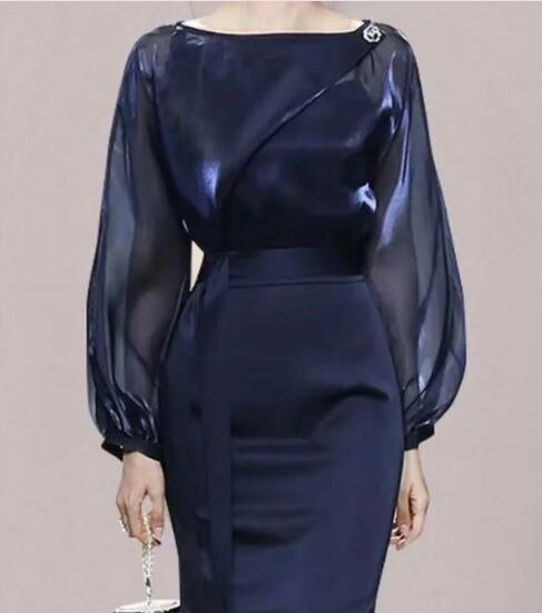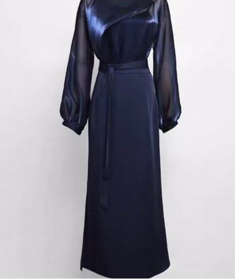 ドルマンスリ-ブのスリット入りドレスです。上半身は光沢のあるさらさらとしたオーガンジー素材で、右のウエストから左の肩にかけてオーガンジーを二枚重ねにし、肩の部分をビジューで留めています。ウエストから裾にかけてはしなやかなシフォン地を使用。共布のリボンベルトがアクセントに。右裾から上に約37cmのスリットが入っていて動くたびに足元を美しくセクシーに見せてくれる異素材が美しい一着です。袖は二の腕をカバーしてくれるドルマンスリーブなのでバストも表示サイズよりゆとりをもって着用いただけます。パーティやイベント、コンサート、結婚式にと、さまざまシーンで活躍してくれる美しい一着。背中ファスナー。裏地なし。リボンベルト付き。