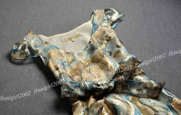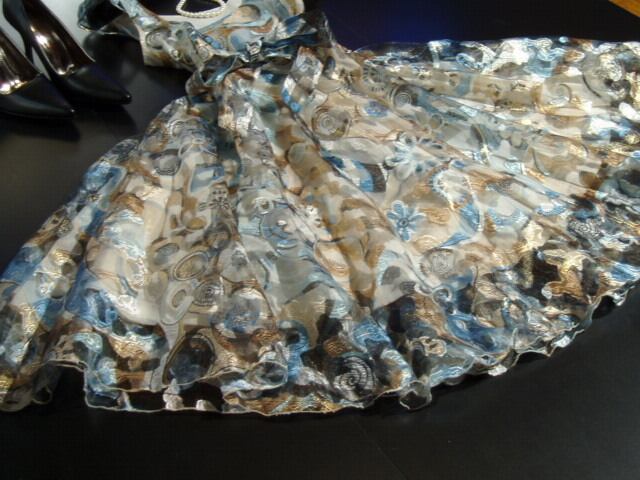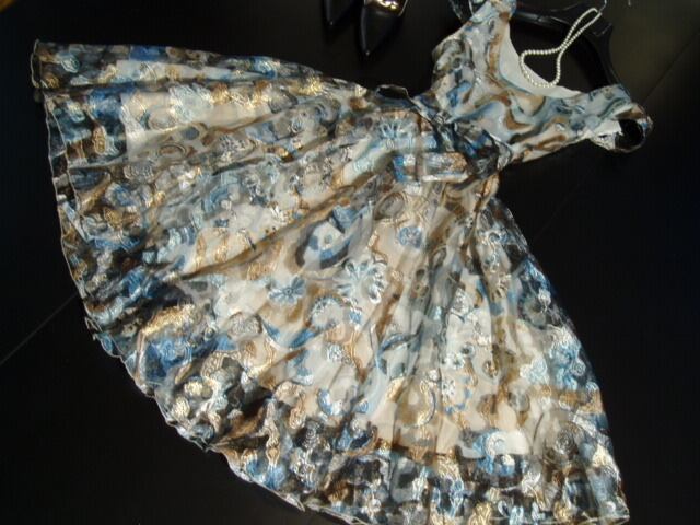 絵画のように美しい模様があしらわれた大変美しいワンピース。裾の透け感が優雅で上品な印象を与えています。ウエストで結ぶ共布のリボンがアクセントになっています。どんなシーンでも視線を独り占めしてくれる一枚です。裏地付き。左サイドファスナー有。ベルト取り外し可能。