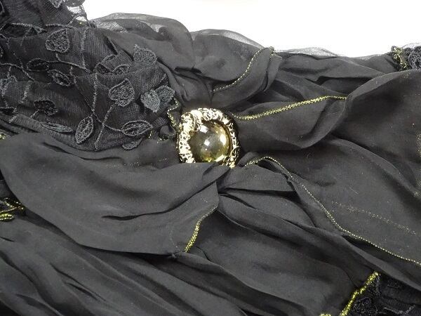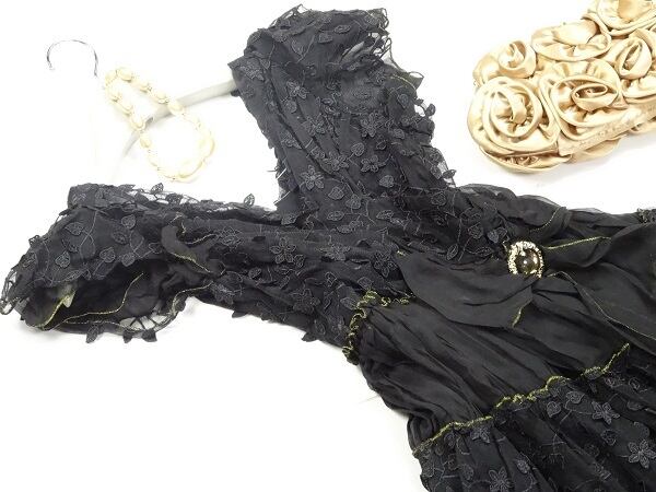 花モチーフレース仕様のワンピース。大きなV字カットの胸元と背中がセクシー。チュール生地をたっぷりと使用し、ランダムに配置された立体花モチーフと、フリルの縁にあしらわれた金の縁刺繍が豪華な印象に。ウエストのフェイクストーンがシックな色味にアクセントプラスしています。エレガントで優しい印象を与えてくれます。デート、お呼ばれ、パーティ、コンサート、結婚式にと、さまざまなシーンに活躍してくれます。左脇下ファスナー。裏地あり。
