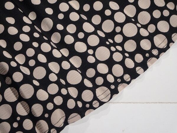 ドット柄やさしいプリーツのワンピース。袖、胸元からウエストにかけて流れる細いプリーツが裾にむけて緩やかなフレアに変化していく綺麗なデザイン。落ち着いたベージュのドット柄も上から下にかけて少しづつ大きくなっていき、全体にアクセントプラスしています。エレガントで優しい印象を与えてくれます。デート、お呼ばれ、パーティ、コンサート、結婚式にと、さまざまなシーンに活躍してくれます。プリーツ仕立てでバスト、ウエストともに伸縮性があります。ファスナーなしのかぶるタイプ。裏地なし。