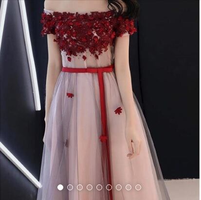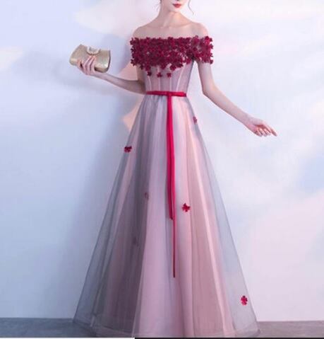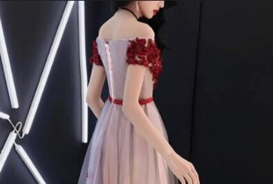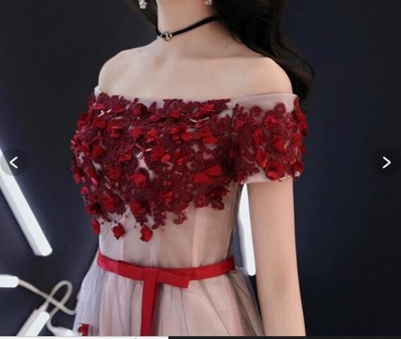 オフショルダーパ-ティ-ロングドレスです。やさしいピンクのサテン地にチュールをかぶせ、胸元と袖、スカート部分には真っ赤なレース刺繍にかわいい花のモチーフをあしらっています。キュートさの中にもセクシーさをあわせもった魅力的なドレスです。背中が腰まで編み紐掛けになっているのでサイズ調整が可能。ウエストの赤いウエストリボンがアクセントに。エレガントで、パーティやイベント、結婚式など、様々なシーンで、気品のある印象を与えてくれる一枚です。裏地あり。背編紐掛け。腰から下ファスナー有。胸パット付き。
