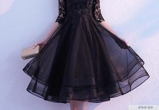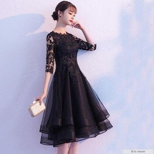 チュールとレースのシックなドレス。黒のサテン地の上に2重のチュールをかぶせ、上半身と袖はレース仕様になっています。シックで品があり華やかな、コンサート、ライブ、結婚式の二次会、パーティにとどんなシーンにも活躍してくれる一着です。裏地あり。背中ファスナ-有。胸パット付き。ウエストはゴム仕様ではないため伸縮性はありません。