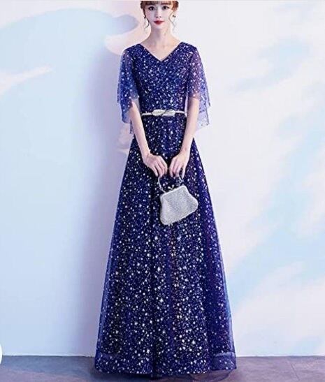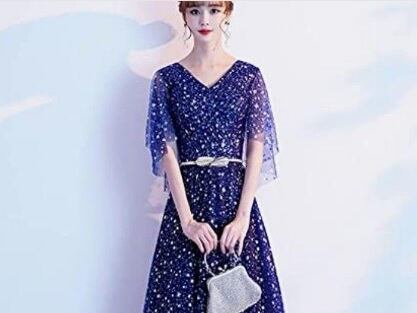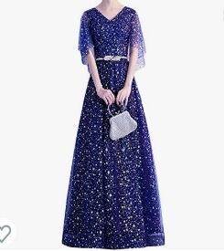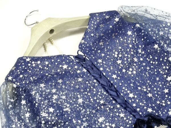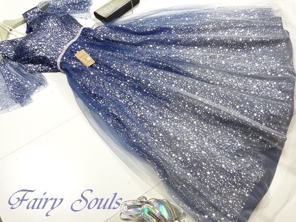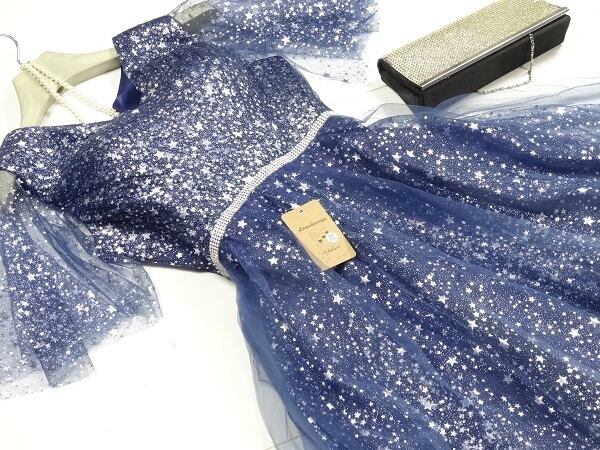 星があしらわれたチュ-ルパーティ-ロングドレスです。深いネイビーのチュール地に小さな星を全体にあしらった豪華な印象のデザイン。背中はウエストから上がリボンの編み上げになっており、腰から下はファスナーが付いています。裏地有。胸パット付き