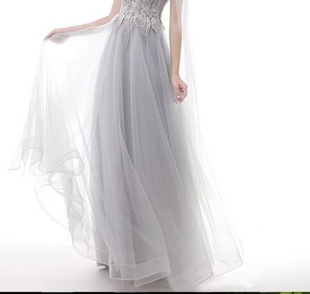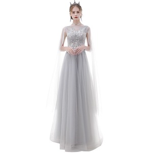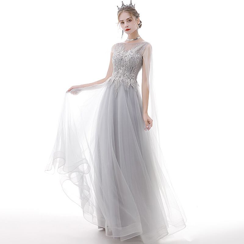 銀糸刺繍とチュールのロングドレス。グレーのサテン地にチュールを重ね全体的にフェミニンでエレガントな雰囲気に。上半身はチュールに銀糸刺繍とビジューをあしらい、肩からチュールをふんわりとかけ、腕をカバーしています。下半身はチュールをたっぷりと使用しゴージャスでな印象に。パーティやイベント、結婚式など、様々なシーンで、気品のある印象を与えてくれる一枚です。裏地なし(チュールとサテンの2枚重ね)。背中編み紐掛け。腰下からファスナ-有。胸パット付。