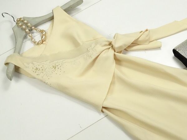 ラメ入りワンサイドフリル使いのワンピース。右肩からサテン刺繍が施されたフリルが左のウエストまでつながりリボンで結ぶデザインになっています。落ち着いたクリームカラーが光の具合でキラキラ光る細かいラメ仕様になっています。ちょっとしたお呼ばれや、デート、パーティ、結婚式にと、さまざまなシーンで活躍してくれる一着です。背中ファスナー。裏地有。