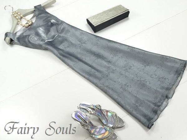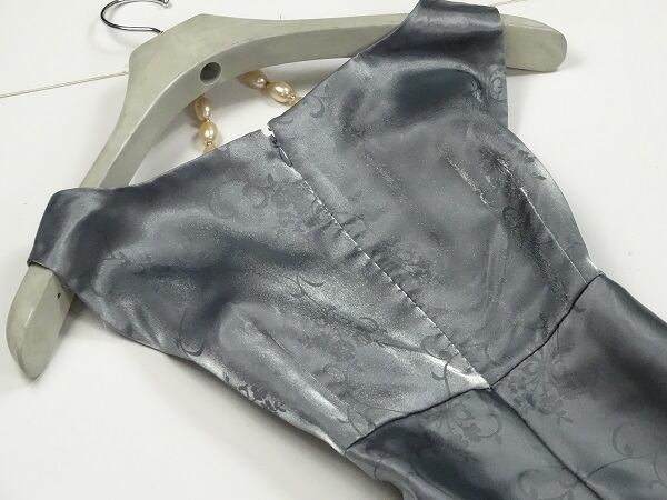 シルバ-の光沢感のあるフォ-マルワンピ-スドレスです。生地全体に同系色の銀糸の花模様が施されとても手の込んだ素敵な一着でワンランク上の商品です!!裏地有。背中ファスナ-有。