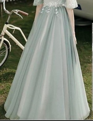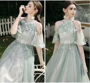 チュール肩見せロング丈パ-ティ-ドレスです。サテン地に若草色のチュールを2重にかぶせたエレガントなデザインです。袖は肩をみせて二の腕からフリル仕様になっています。トップス部分から袖にかけての刺繍がエレガントで大人の魅力をアップ。パーティやイベント、結婚式など、様々なシーンで、気品のある印象を与えてくれる一枚です。背中結び紐有り。背中腰から下ファスナ-有。胸パット付