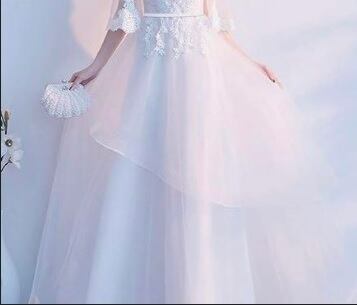 刺繍飾りのプリンセスウエディングドレス。トップス部分には立体的な刺繍をほどこしてピュアで清楚な雰囲気に。袖は透け感のあるチュールをたっぷりと使用し、ふんわりと二の腕をおおいカバーしてくれています。胸元からウエスト下にかけて綺麗なAラインに広がり豪華かつエレガントな雰囲気を醸し出しています。ウエディングドレスとしても、また、パーティやイベント、結婚式など、様々なシーンで、気品のある印象を与えてくれる一枚です。裏地なし。(裏地にしっかりとしたサテン地を使用しているので透け感はありません)背中ファスナ-有。胸パット付。パニエは付いておりません。