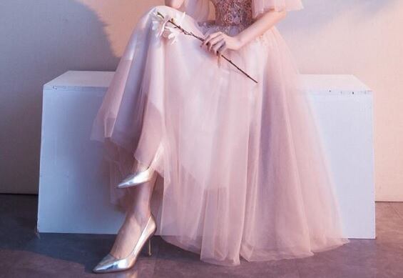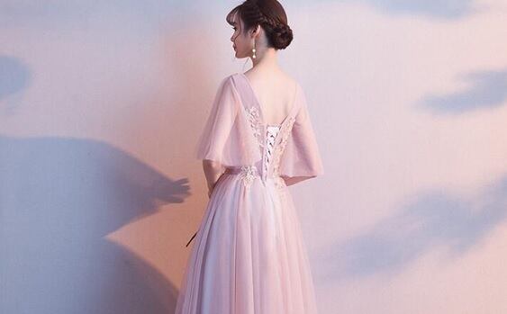 チュール袖フリルのパ-ティ-ロングドレス。ピンクのサテン地の上に同色のチュールを重ねた豪華な仕様。トップス部分は立体刺繍を施し、袖は肩からたっぷりとチュールを使用した広がるデザインで動きやすくなっています。背中はウエスト部分まで編紐掛けなので、バストサイズにゆとりをもって着用いただけます。パーティやイベント、結婚式など、様々なシーンで、気品のある印象を与えてくれる一枚です。裏地有。背中網掛け。腰下ファスナ-有。胸パット付き。