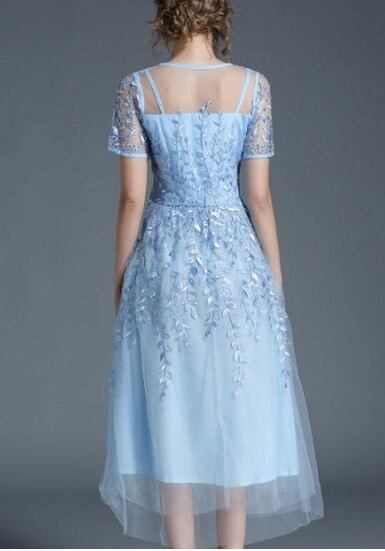 花柄刺繍レースミディ丈ワンピ-ス。爽やかなブルーの下地に、光沢のある糸で刺繍を施した同色のチュールを重ねています。袖やデコルテの透け感がとても美しく大人の女性を醸し出してくれるエレガントなワンピ-スです。デザイン性のあるスタイルがとても魅力的な一着です。全体的に優しい感じに仕上げられています。裏地有。左サイドファスナ-有。