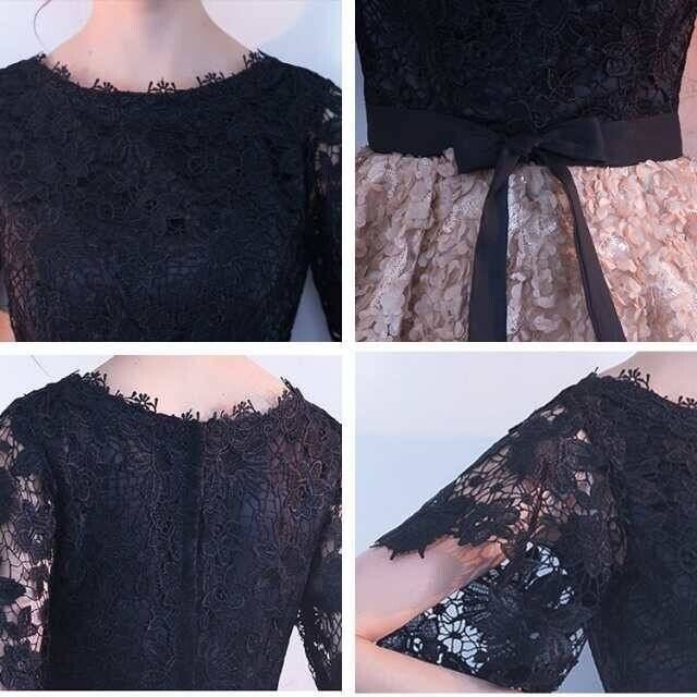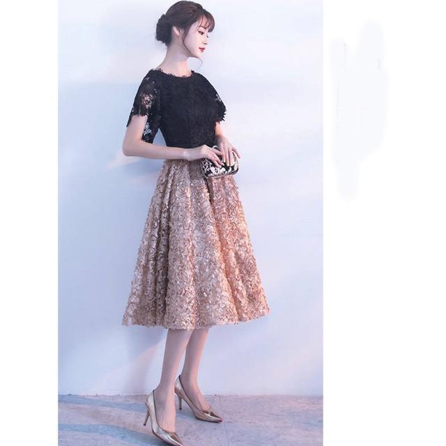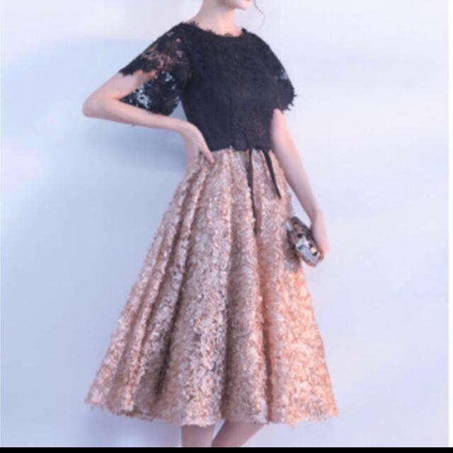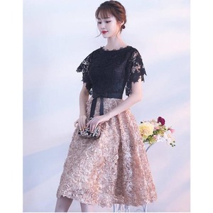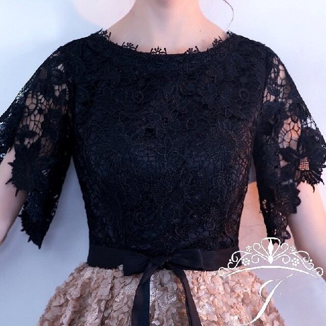 トップスレ-ス仕立ドレスワンピース。トップスは黒のレ-ス仕立て。スカート部分はピンクベージュの花レース風。女性らしさとエレガントさを同時に演出した一品です。胸パット入り。ウエスト黒サテンリボン付き。背中ファスナー有。裏地付。