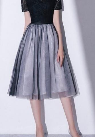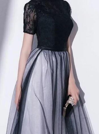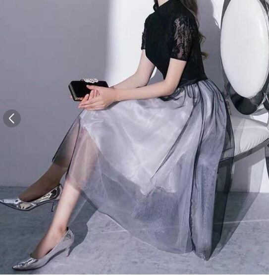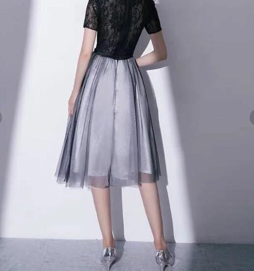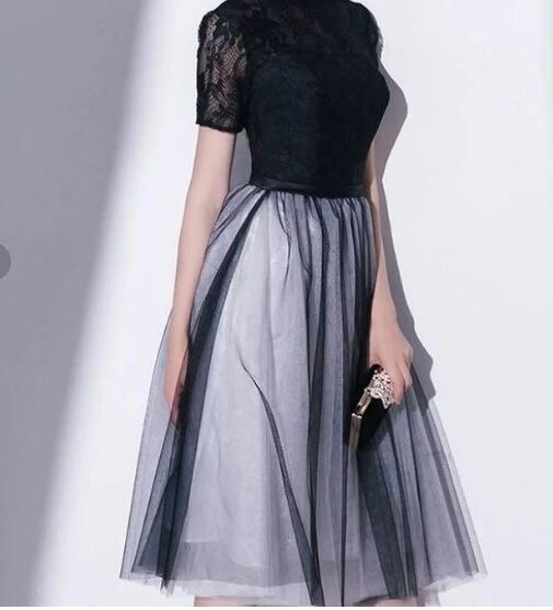 レースとシフォンの半袖ワンピース。上半身は黒のボタニカルレースを使用し、ウエストから裾にかけてはシルバーのサテン地の上に白と黒のチュールを二枚重ねボリュームを出しています。立て襟と半袖がフォーマル感を演出し、長い季節着用いただけます。パーティやイベント、結婚式など、様々なシーンで、気品のある印象を与えてくれる一枚です。裏地あり。背中ファスナ-有。胸パッド付。