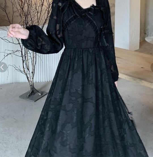 胸元フリルの長袖ワンピース。ゆったりと広がったフレアが綺麗なAラインのシルエット。ボタニカル柄がプリントされた生地をたっぷりと使用し、胸元はフリルをカシュクール風に配置。シックな中にフェミニンな印象をあわせもつ魅力的なデザインです。パーティやイベント、コンサート、結婚式にと、さまざまシーンで活躍してくれる美しい一着。左脇ファスナー。裏地付。