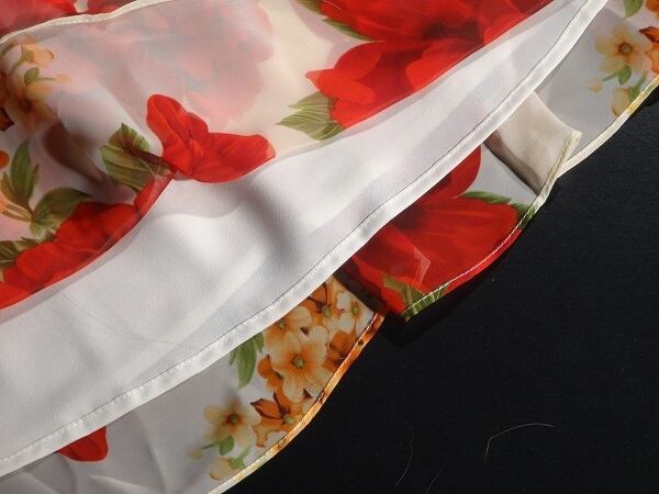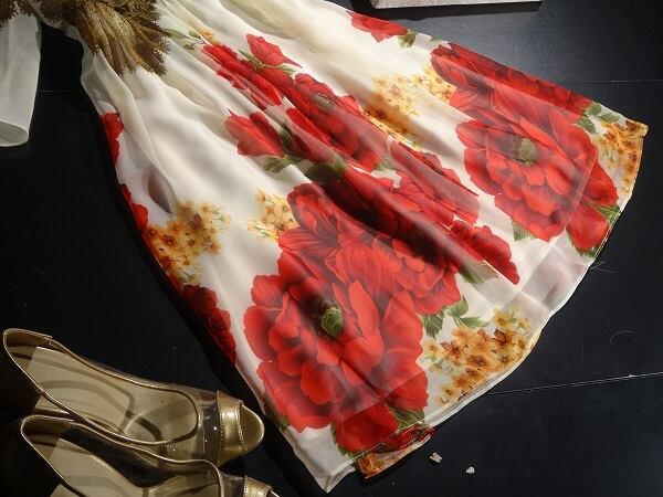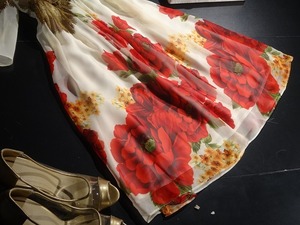 フラワープリントのカシュクールワンピース。しなやかなクリーム色のシフォン生地に、赤い花柄がプリントされ華やかな印象に。胸元はカシュクール仕立てで大人の女性らしさを表現。袖はゆったりサイズで気になる二の腕を隠してくれます。エレガントで優しいデザイン。デート、お呼ばれ、パーティ、コンサート、結婚式にと、さまざまなシーンに活躍してくれます。ウエストゴム仕様でサイズ的にゆとりをもって着用いただけます。ファスナーなしのかぶるタイプ。裏地あり。