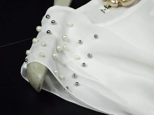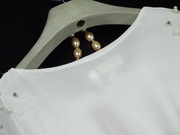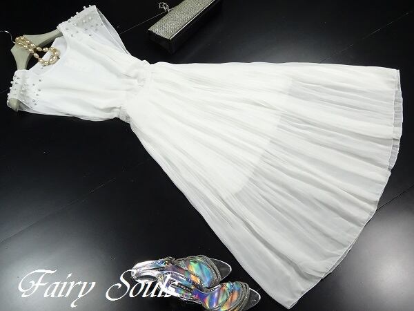 ビジュー飾りしなやかシフォンのワンピース。ゆるやかなラウンドネック。両肩にはフェイクパールとビジューをあしらい上品で優しい印象に。ウエストはゴム仕様でサイズ的にゆとりをもって着用いただけます。ファスナーなしのかぶるタイプ。透けるタイプなので気になる方はインナー着用をお勧めします。裏地付。