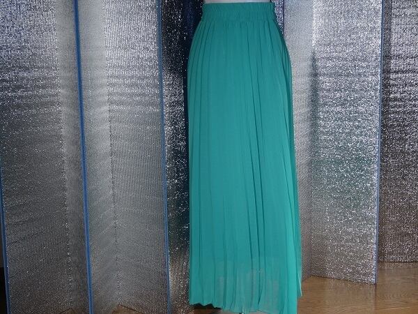 ロング丈さわやかグリーンのプリーツスカ-ト。しなやかで軽やかなシフォンが上品な印象をあたえています。ウエストは総ゴム仕様でサイズにゆとりがあります。ファスナーなし。裏地付。