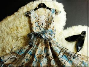 絵画のように美しい模様があしらわれた大変美しいワンピース。裾の透け感が優雅で上品な印象を与えています。ウエストで結ぶ共布のリボンがアクセントになっています。どんなシーンでも視線を独り占めしてくれる一枚です。裏地付き、サイドファスナー、ベルト取り外し可能。