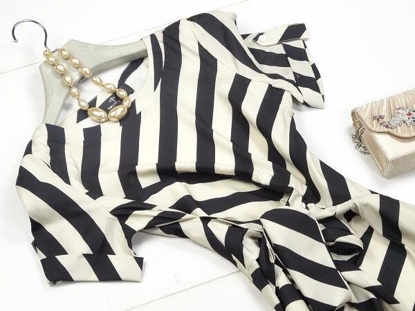 幅広のボーダーが優雅でマリン気分エレガントなデザインが上品かつ優雅な女性を演出してくれます。色々な場面で貴方を輝かせてくれます。裏地あり。