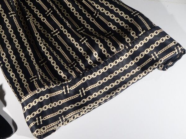 チェーン模様サテン地のフレアスカート。黒にゴ-ルドのチェーン模様がプリントされた華やかな一着。つややかなサテンが着心地抜群です。サイドファスナー。裏地あり。
