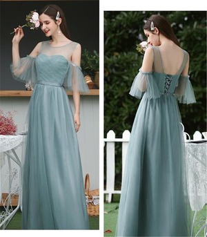 チュールロング丈パ-ティ-ドレスです。タ-コイズグリ-ンのサテン地に同色のチュールをかぶせたエレガントなデザイン。袖は肩をみせて二の腕からフリル仕様になっています。デコルテラインはチュールのみでほんのり透け感が大人の魅力をアップ。パーティやイベント、結婚式など、様々なシーンで、気品のある印象を与えてくれる一枚です。背中結び紐有り。背中腰から下ファスナ-有。胸パット付。透明な肩紐付き。裏地有。
