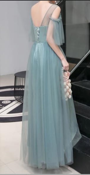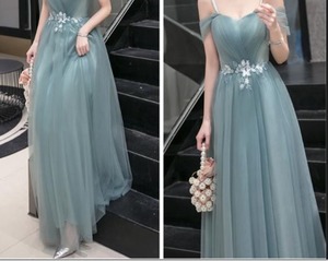 チュールロング丈パ-ティ-ドレスです。タ-コイズグリ-ンのサテン地に同色のチュールをかぶせたエレガントなデザイン。袖は肩をみせて二の腕からフリル仕様になっています。デコルテラインはチュールのみでほんのり透け感が大人の魅力をアップ。パーティやイベント、結婚式など、様々なシーンで、気品のある印象を与えてくれる一枚です。背中結び紐有り。背中腰から下ファスナ-有。胸パット付。透明な肩紐付き。裏地有。