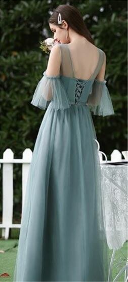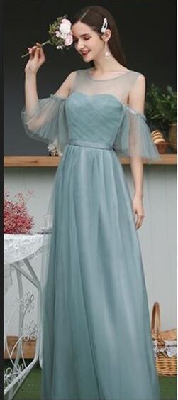チュールロング丈パ-ティ-ドレスです。タ-コイズグリ-ンのサテン地に同色のチュールをかぶせたエレガントなデザイン。袖は肩をみせて二の腕からフリル仕様になっています。デコルテラインはチュールのみでほんのり透け感が大人の魅力をアップ。パーティやイベント、結婚式など、様々なシーンで、気品のある印象を与えてくれる一枚です。背中結び紐有り。背中腰から下ファスナ-有。胸パット付。透明な肩紐付き。裏地有。