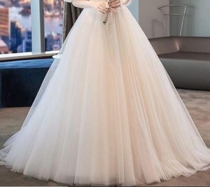 ネットチュールのオフショルダードレス。トップス部分はデコルテラインを美しく魅せるオフショルダーで、肩紐の付け根からチュールのフリルをあしらい二の腕をしっかりカバー。胸元からウエストにかけてタックをとり立体的な仕様に。背中は腰まで編み紐掛けになっていて、紐の締め具合でバストサイズを調整できます。腰から下はファスナーになっているので着脱がしやすくなっています。デザイン性があり、豪華かつエレガントな雰囲気を醸し出しています。ウエディングドレスとしても、また、パーティやイベント、結婚式など、様々なシーンで、気品のある印象を与えてくれる一枚です。裏地なし(サテン地とチュールの2枚重ね)。背中編み紐掛け。腰下ファスナー。胸パット付。