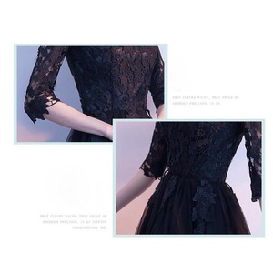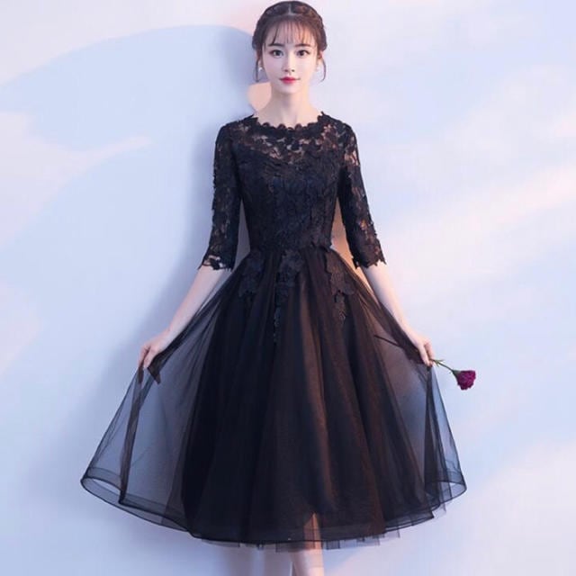 チュールとレースのシックなドレス。黒のサテン地の上にチュールをかぶせ、上半身と袖はレース仕様になっています。シックで品があり華やかな、コンサート、ライブ、結婚式の二次会、パーティにとどんなシーンにも活躍してくれる一着です。裏地あり。背中ファスナ-有。胸パット付き。ウエストはゴム仕様ではないため伸縮性はありません。