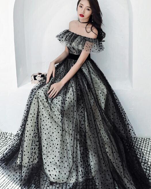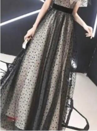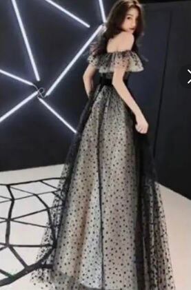 水玉模様チュ-ルオフショルダードレスです。トップス部分はデコルテラインを美しく魅せるオフショルダー。全体的に水玉模様が施されたチュ-ルがサテン地に重ねられた優しい印象で豪華かつエレガントな雰囲気を醸し出しています。パーティやイベント、結婚式など、様々なシーンで、気品のある印象を与えてくれる一枚です。裏地なし。背中編み紐掛け。胸パット付。