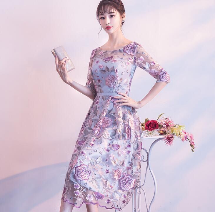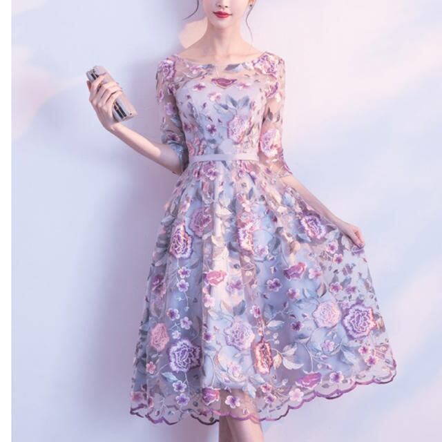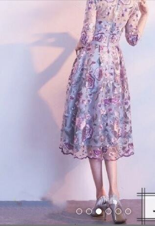 花柄刺繍のミディアムワンピース。シルバーグレーのサテン地の上に、光沢のある糸で花模様の刺繍を施したネットチュールを重ねた、とても美しく豪華で大人の女性を醸し出してくれるエレガントなワンピースです。デザイン性があり華やかの印象ですので、ちょっとおしゃれな普段着としても、またパーティや結婚式の二次会、コンサートにと、様々なシーンで活躍してくれる一着です。裏地有。背中ファスナ-有。胸パット付き。