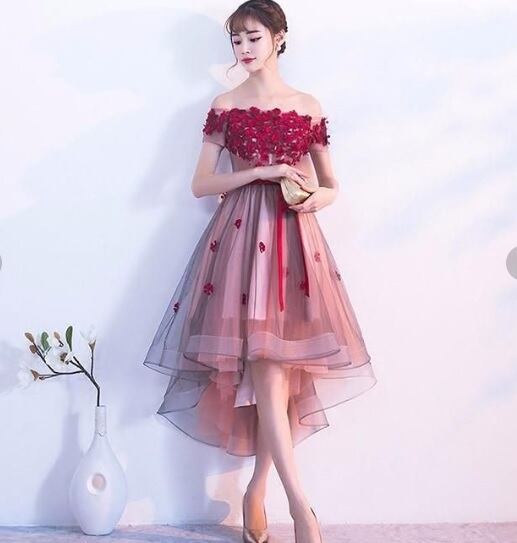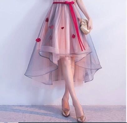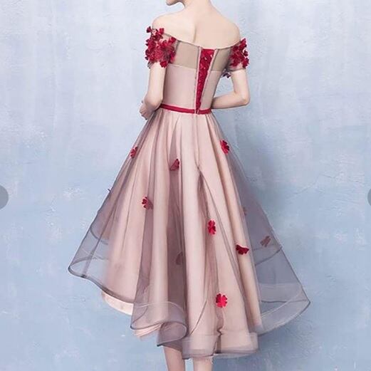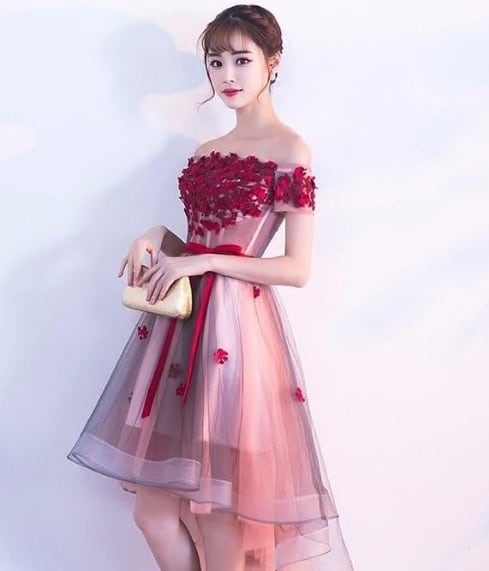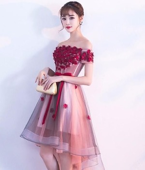 フィッシュテ-ルのパ-ティ-ドレス。やさしいピンクのサテン地にチュールをかぶせ、胸元と袖、スカート部分には真っ赤なレース刺繍にかわいい花のモチーフをあしらっています。前と後ろで裾の長さが違うフィッシュテール型。胸元から肩にかけてはチュールのみを使用しているので、着用時オフショルダーに見え、キュートさの中にもセクシーさをあわせもった魅力的なデザインになっています。背中が腰まで編み紐掛けになっているのでサイズ調整が可能。ウエストの赤いウエストリボンがアクセントに。エレガントで、パーティやイベント、結婚式など、様々なシーンで、気品のある印象を与えてくれる一枚です。裏地あり。背編紐掛け。腰から下ファスナー有。胸パット付き。