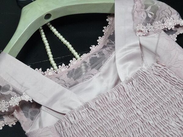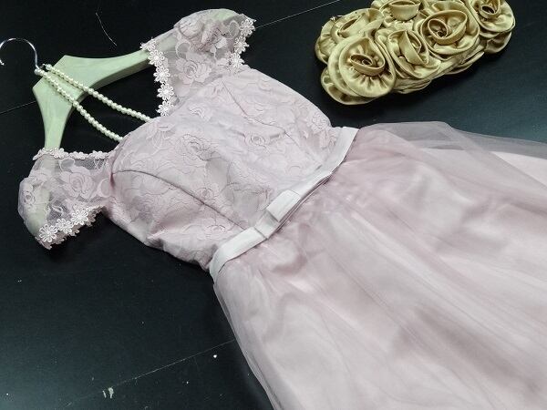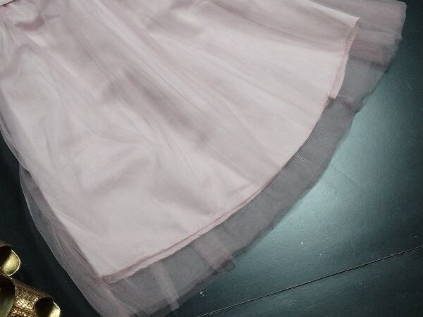 半袖チュールの膝丈パーティドレス。袖はかわいい印象のフレンチタイプ。トップス部分はチュール地に花の刺繍をほどこし、ウエストのリボンで切り替えています。スカート部分はピンクのサテン地の上に同色のチュールを重ねボリューム感があります。背中部分はシャーリング仕様になっているのでバストサイズに伸縮性があります。パーティやイベント、結婚式など、様々なシーンで、キュートで気品のある印象を与えてくれる一枚です。裏地付き。右脇ファスナー有。胸パット付。