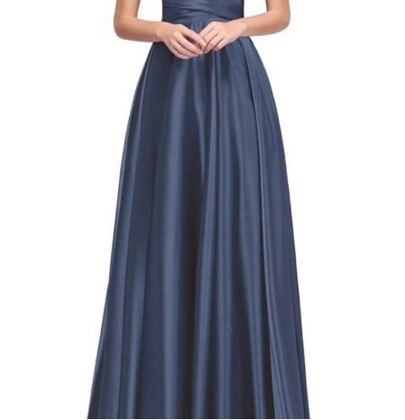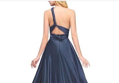シックな紺のワンショルダーのロングドレス。落ち着いた紺のジャージ素材をたっぷり使用した豪華でデザイン性のあるスタイルがとても魅力的な一着です。フロント側は左肩からウエストにかけてタックをとり、中央できゅっと絞り、ウエストから裾まではたっぷりと生地を使用してシックな中にも豪華な印象になっています。背中側は肩から伸ばした生地をねじって絞り、ウエストから回した布と背中中央でからませ、ウエスト部分はリボンを結んだデザインになっています。背中側を大きく開けてセクシー感を出し、ワンショルダーがデコルテラインを美しく見せていて、セクシーでいて上品な感じに仕上げています。背中ファスナ-有。裏地なし。ジャージ素材なので伸縮性があります。