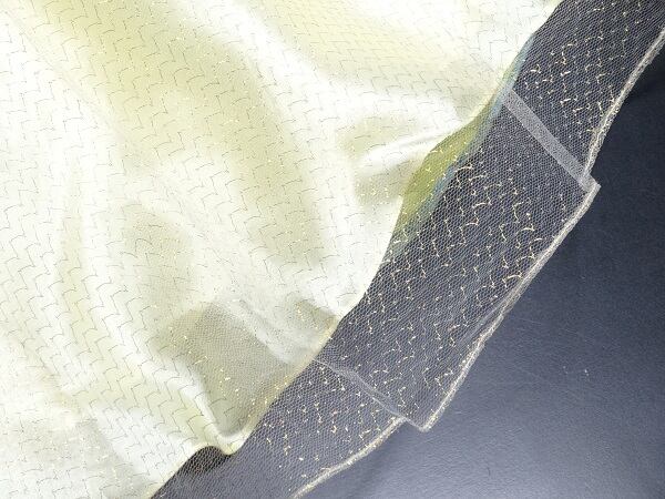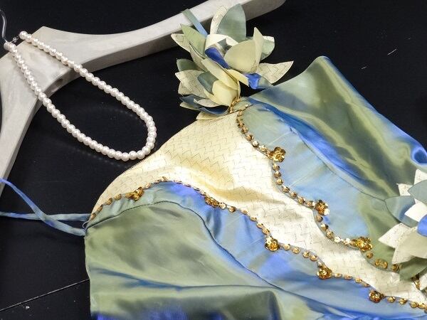 スパンコール飾りチュールのプリンセスドレス。金糸柄の黄色のネットチュールの上にメタリックグリ-ンのサテン地を重ね、サテン地の合わせ部分には金のスパンコールとビーズやリーフのモチーフをあしらった豪華で美しいデザインになっています。華やかなシーンにぴったりのプリンセス仕様のドレスです。裏地なし(サテン地にチュール地を重ねています)。背中ファスナー付。胸パット付き。
