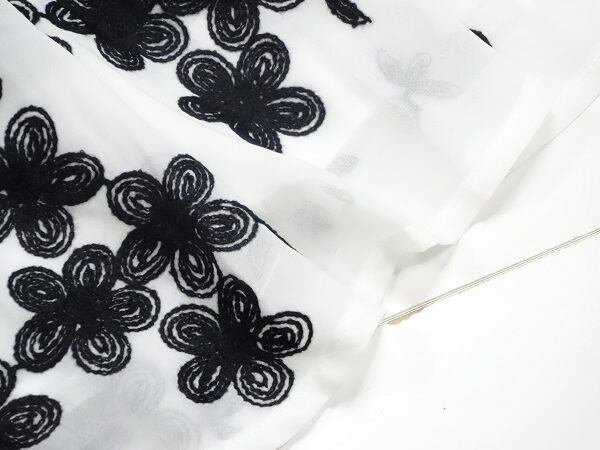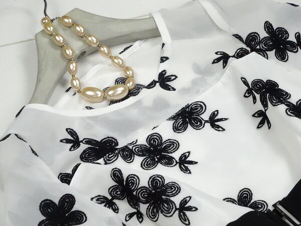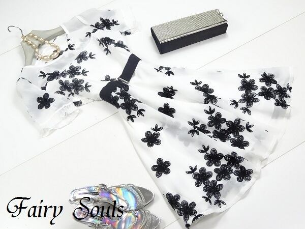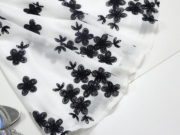 胸元透け感花刺繍のシックなワンピース。やわらかな白地に手書き風ポップな花模様を黒の糸で刺繍しています。シックな色合いに、袖先のフリルがキュートさをプラス。ウエストの黒のベルトがアクセントになっています。デート、お呼ばれ、パーティ、コンサート、結婚式にと、さまざまなシーンに活躍してくれます。ベルト付き。脇下ファスナー。裏地あり。