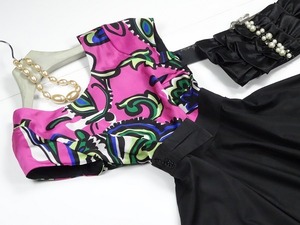 カラフルポップな柄の切替ワンピース。黒のたっぷり生地を使用したスカートと対照的に、上半身はカラフルでポップな柄が魅力的。幅広、ハイウエストなデザインは、下半身を長くみせてくれる効果も。やわらかな生地は多少伸縮性あり。エレガントで優しい印象を与えてくれます。デート、お呼ばれ、パーティ、コンサート、結婚式にと、さまざまなシーンに活躍してくれます。背中ファスナー。裏地あり。