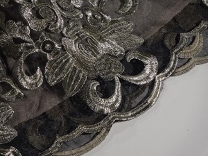 レースと金刺繍大きな丸襟のワンピース。トップス部分は黒のレースに細い金糸の縁取りを配し、レースの隙間からベージュの下地が見えて黒とベージュの綺麗なコントラスト作っています。スカート部分は透け感のある黒のシフォン地に金糸で花柄を刺繍。襟元の大きな黒の襟が豪華さにキュートな印象をプラスしています。エレガントで優しい印象の一着。デート、お呼ばれ、パーティ、コンサート、結婚式にと、さまざまなシーンに活躍してくれます。背中ファスナー。裏地あり。