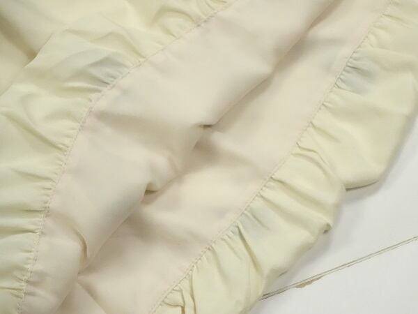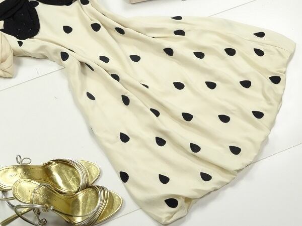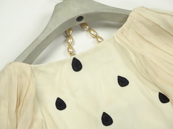 しなやかなシルク生地にしずく模様が刺繍され胸元の大きなリボンがアクセントになっていて袖のプリ-ツがとても女性らしいワンピースです。やさしくてフェアリーな一着です。ファスナーあり。裏地つき。