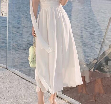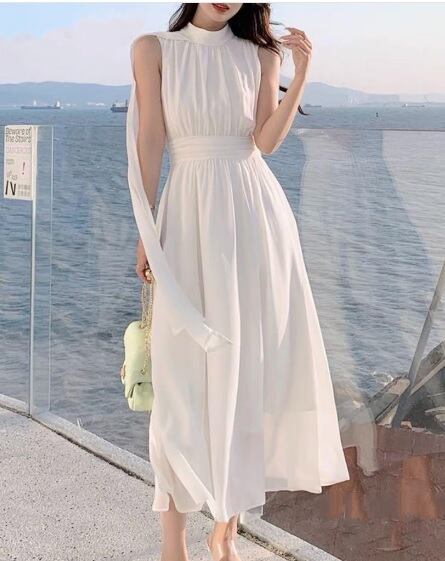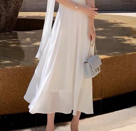 さらさらシフォン片側ストール仕立てのワンピース。ピュアな白のさらさらとした麻のようなシフォン地をふんだんに使用。首から右肩にかけてストールのように布を流しているユニークなデザイン。優雅で品の良いシルエットを作っています。太陽に映える美しい一着です。背中ファスナー。裏地あり。