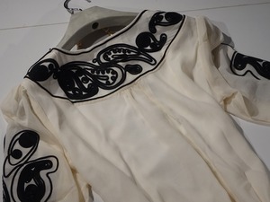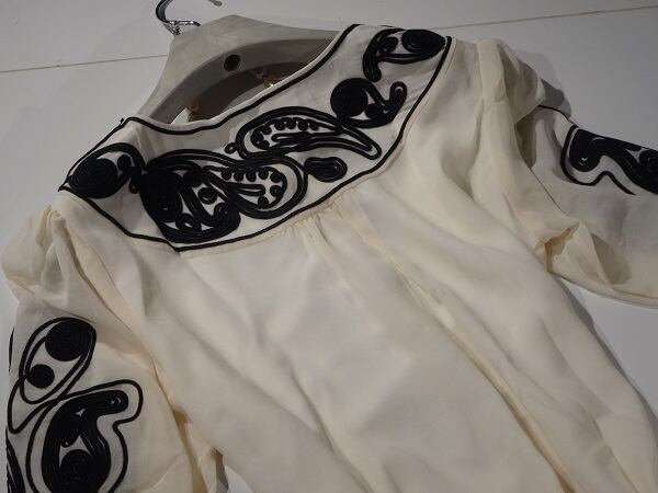 パイピングアートがとても印象的なシフォン素材のワンピースです。胸元や裾や袖に施されたパイピングアートがとても繊細で優しい印象を与えてくれます。シフォンの柔らかな素材は、肌触りもとても良いです。前ボタン6個有。裏地あり。