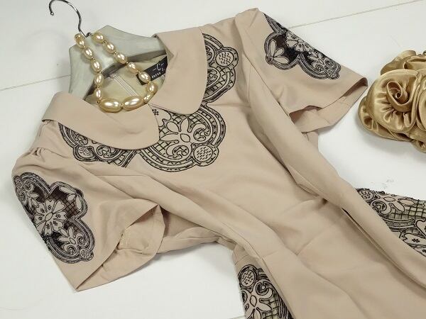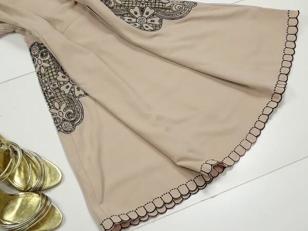 繊細な刺繍模様がとてもお洒落でしぐさを優雅に見せてくれる贅沢なお洋服です。シンプルだけれど存在感にあふれたデザイン。デートやお呼ばれ、ライブやパーティなど、様々なシーンで活躍してくれる一着です。背中ファスナー有。裏地有。