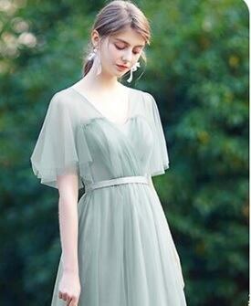 チュールロング丈パーティードレス。シルバ-サテン地の上にシックなペパーミントグリーンのチュールをかぶせています。胸元はバストの上でフリルをとり、ウエストにかけて中央にタックをとった華やかなデザイン。背中は腰まで編み紐掛けになっているので、編み紐の締め具合でバストサイズを調整いただけます。袖は肩から袖先にかけて広がったネットチュールを使用。フェミニンでかつエレガントな雰囲気に。パーティやイベント、結婚式など、様々なシーンで、気品のある印象を与えてくれる一枚です。裏地有。背中編み紐掛け。腰下ファスナ-有。胸パット付。