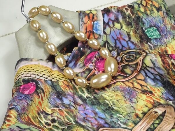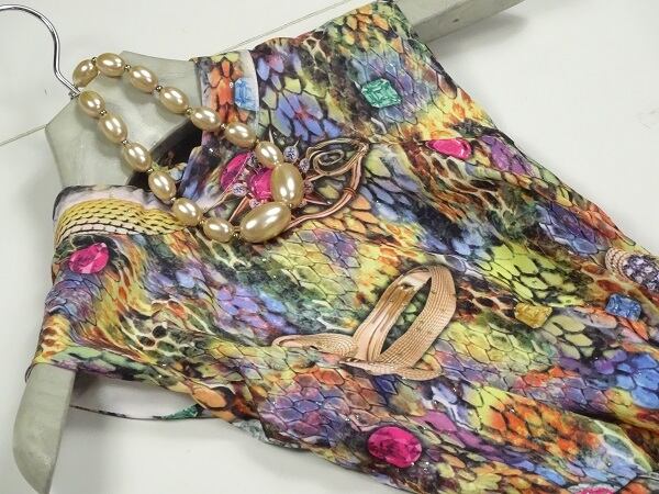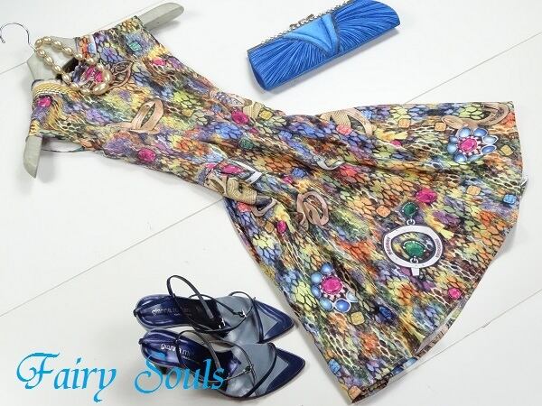 ジュエリ-プリントラメ輝きワンピ-スです。着心地もとても良くこの一で華やぎます。裏地あり。背中サイドファスナ-有。