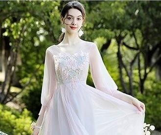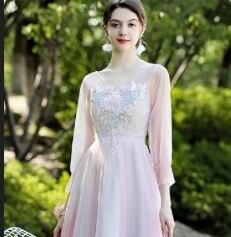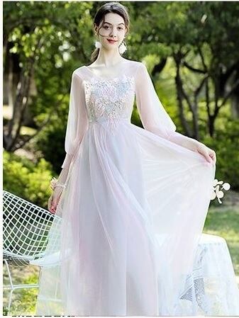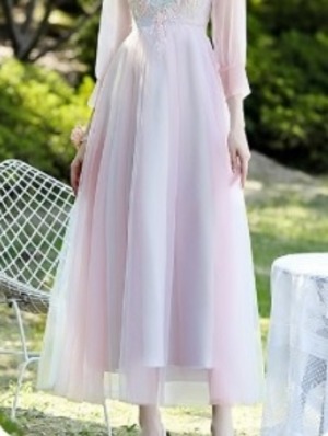 チュールロング丈のパーティードレス。やさしいスモーキーピンクのサテン地の上に、同色のチュールを2枚重ね、背中はシャ-リングのデザインで優しい印象のドレス。上半身には同色の糸でボタニカル柄を刺繍。袖はチュールのみで肌をほんのり見せ、袖先をゴムをしぼることで可愛らしさがアップ。裾までは2重のチュールをたっぷりと使用しボリューム感を出しています。フェミニンな中にも大人の魅力を感じさせてくれています。パーティやイベント、結婚式など、様々なシーンで、気品のある印象を与えてくれる一枚です。右後ろサイドファスナ-有。裏地なし。胸パット付き。