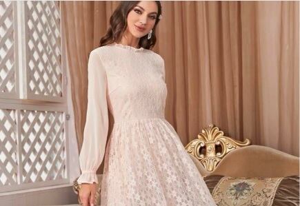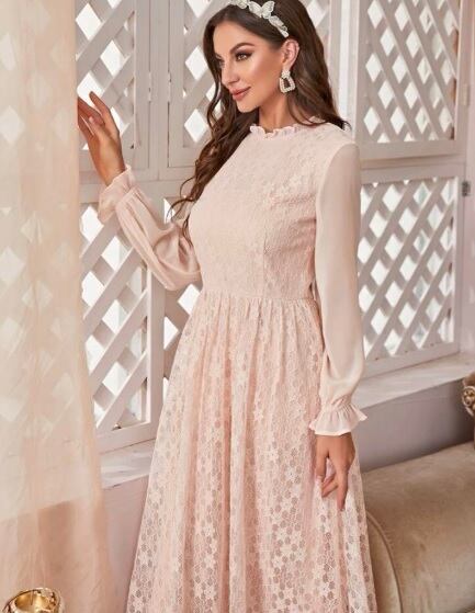 総レ-スフォーマルミモレ丈長袖ワンピ-スです。全体的にレースが重ねられ、袖部分のみチュールのみで肌をほんのり見せ、袖先をゴムをしぼることで可愛らしさがアップ、大人の女性を醸し出してくれる一着です。裏地あり。背中ファスナ-有。