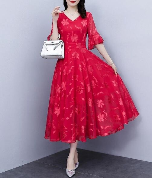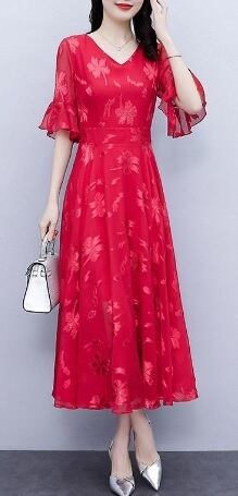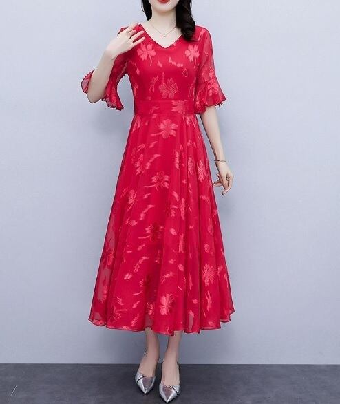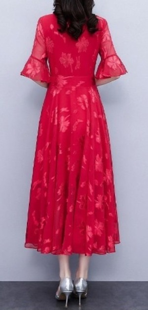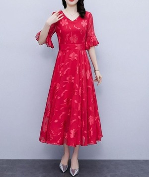 半袖フレア-シフォンのワンピ-ス。鮮やかな赤のシフォン地に光沢のある糸で刺繍を施したようなプリントがされた華やかな印象のデザイン。胸元はちょっとセクシー感のあるV字カット。袖先はフリルでキュートな印象に。ウエストから裾にかけてフレア-が広がり女性らしさを引き立ててくれています。パーティやイベント、結婚式など、様々なシーンで、気品のある印象を与えてくれる一枚です。裏地有。右脇ファスナ-有。