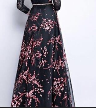 ネットチュールのパーティロングドレス。トップス部分は黒のネットチュールに細かな模様を編み込み、ウエストから裾までは艶のある赤と白の小花をプリントしたネット地をふんだんに使用し、流れるようなデザインがとても綺麗なスタイルを醸し出してくれています。全体的に優しい感じに仕上げられています。背中ファスナ-有。裏地なし。胸パッド付。