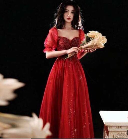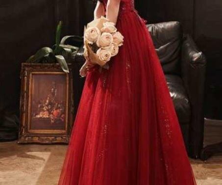 ビーズ刺繍とチュールのロングドレス。赤のサテン地の上に刺繍とビーズをあしらい、同色のチュールを3枚重ねた華やかなデザイン。袖のチュールが気になる二の腕を隠してくれます。背中は編紐掛け仕様になっているのでサイズにゆとりをもって着用いただけます。パーティやライブ、イベント、結婚式など、どんなシーンでも活躍してくれる一着です。裏地なし。背中編み紐掛け。胸パット付き。