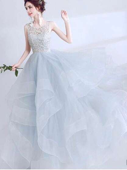 レースフィッシュテールのパーティドレス。フロントのレースの透け感と、オ-プンバックがセレブリティ-な雰囲気を醸し出しています。ウエストから裾にかけて、チュールが2重に重なりボリューム感のある華やかな印象です。ウェディングドレスとしても、またパーティやコンサートにと、晴れやかなシーンにふさわしい一着です。背中ファスナー有。裏地あり。胸パット付き。